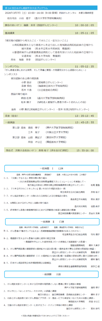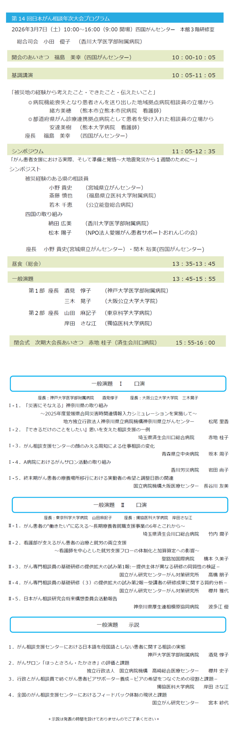 - 本大会は国立がん研究センター「認定がん専門相談員」のⅣ群(1単位)の研修となります。